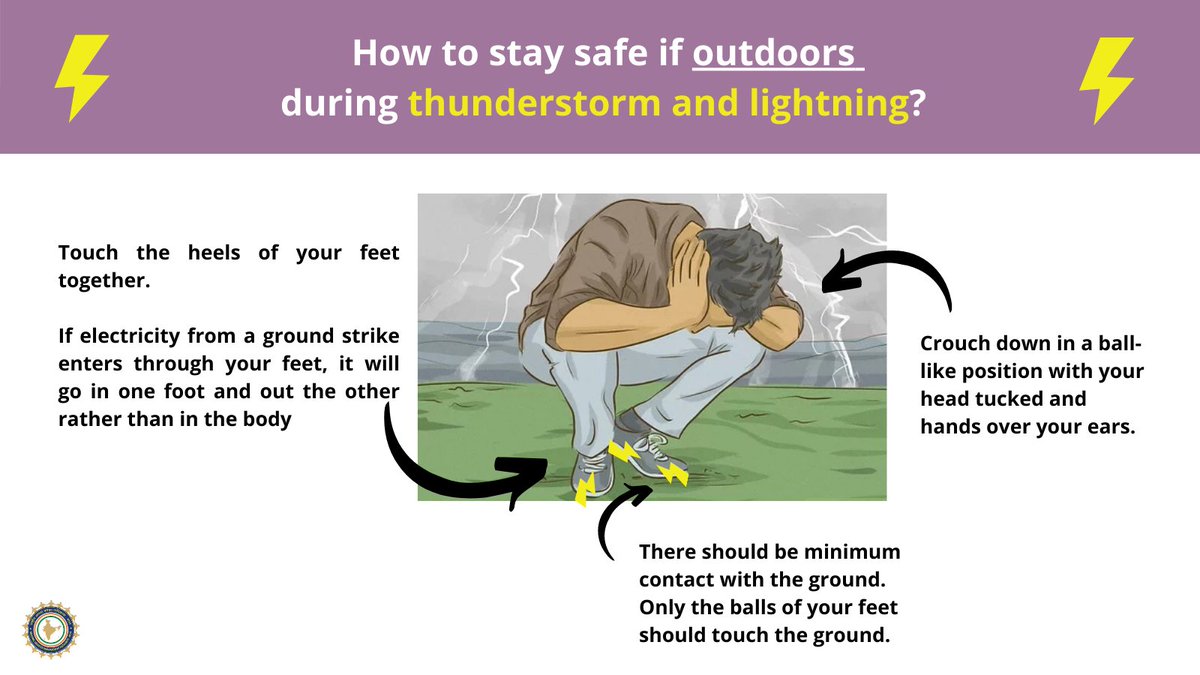 - Stay away from tall objects like poles, trees as lightning strikes high objects