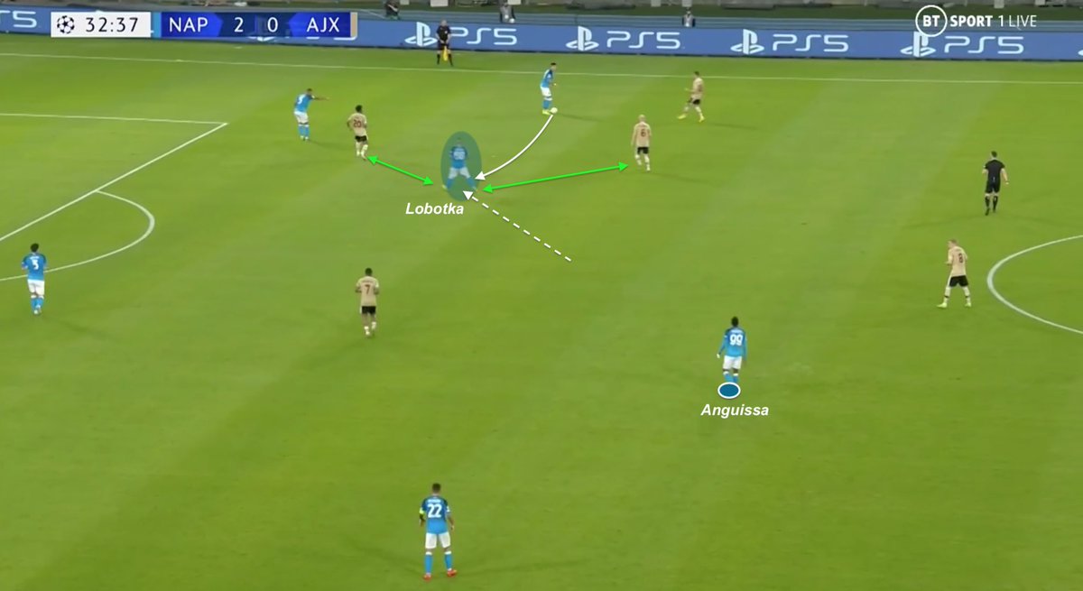 LOBOTKA’S POSITIONING If Napoli succeeds so many times to escape central pressure, it’s because Spalletti designed a versatile midfield, with much freedom on positions, but strict roles in pass schemes. Zielinski under pressure => Lobotka => Anguissa is the main pass pattern.
