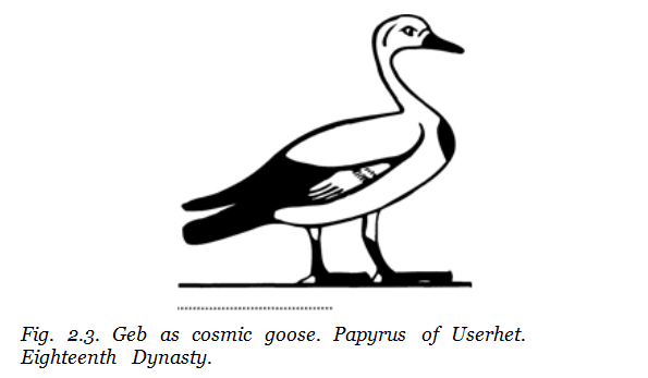 The cosmic goose would appear to be an image of the androgynous Creator of Worlds, whom in the Heliopolitan theology is Atum-Ra. Just as it is from the goose’s egg that life arises, so it is from the god Geb at the beginning of time that life emerges and takes on material form.