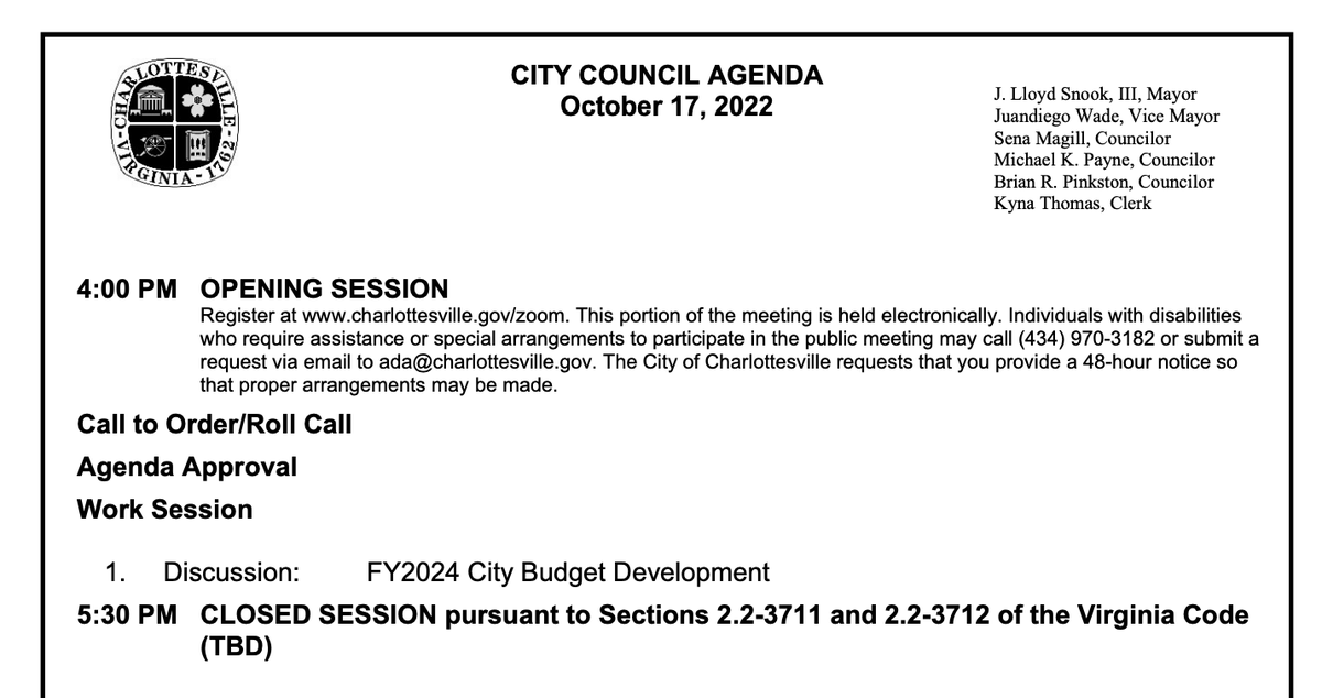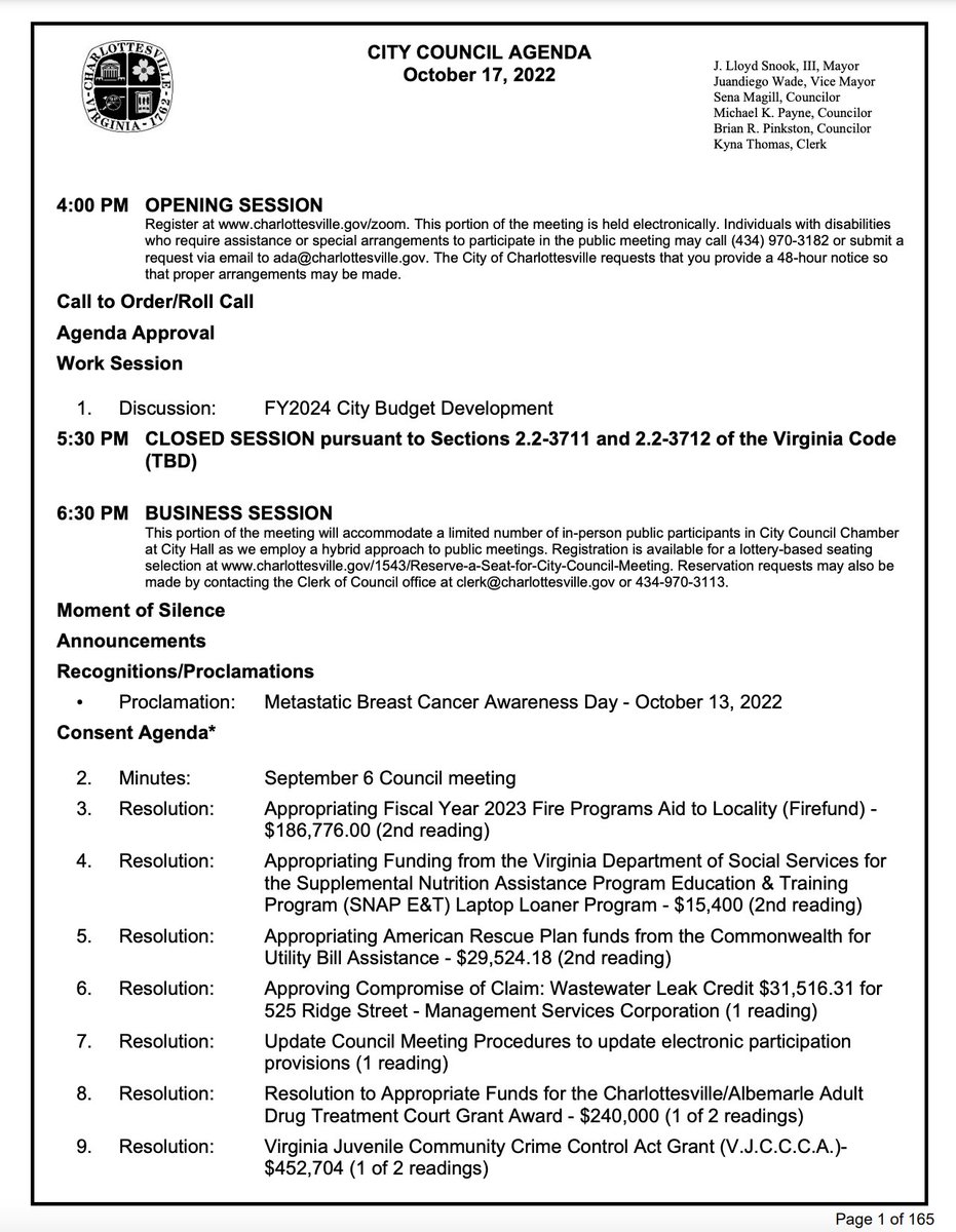 here's the agenda for the regular business meeting of the charlottesville city council, which should be getting underway in a few minutes. it looks long, but a lot of those items should be quick votes on things already settled.