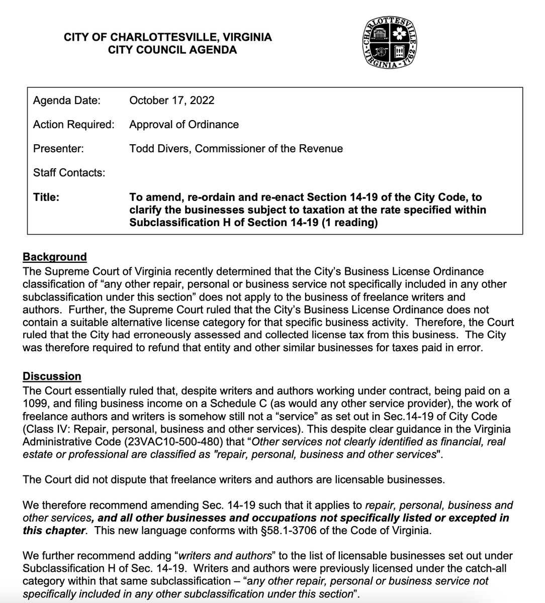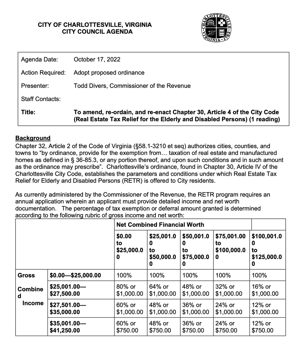 we are officially tabling this until the first meeting in november. the city attorney & the commissioner of revenue will bring it back with clarifications & edits. divers emphasizes that it can't wait any longer than that because they need to get underway for the next year soon.