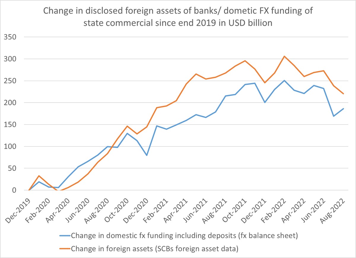 I am fascinated by the state banks' reported use of swaps to raise dollars to cover their fx sales on Monday -- all the more so b/c the state banks aren't obviously lacking in fx assets.