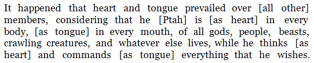 The cosmogony as such begins with these words: “There came into being as the heart and there came into being as the tongue something in the form of Atum.” This can also be translated thus: “In the form of Atum there came into being heart and there came into being tongue.”