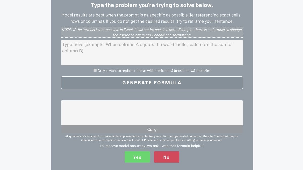 Excel Formula Bot uses AI to transform text instructions to an excel formula.