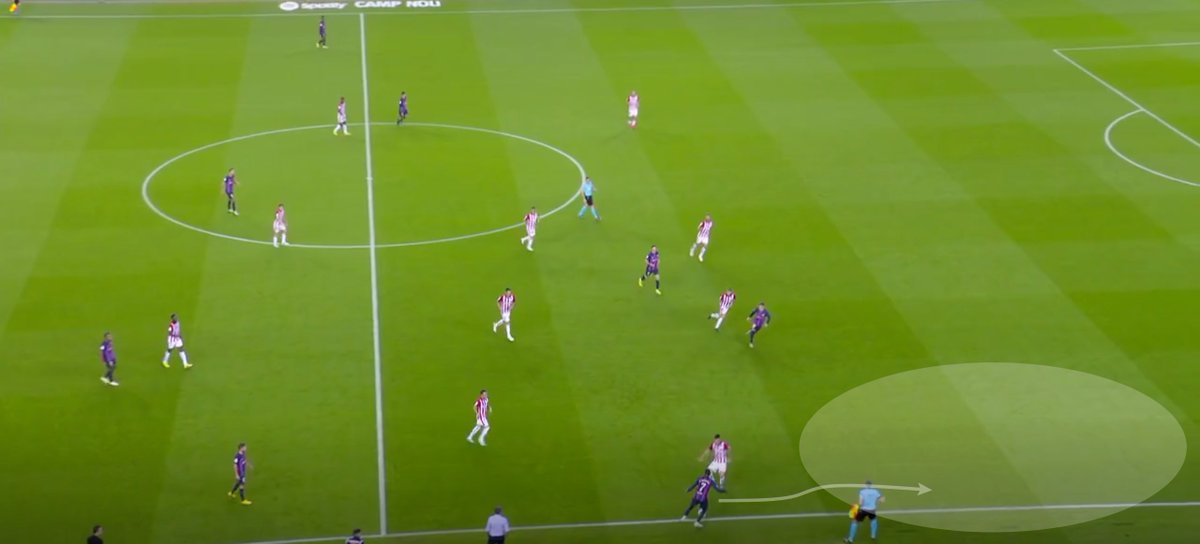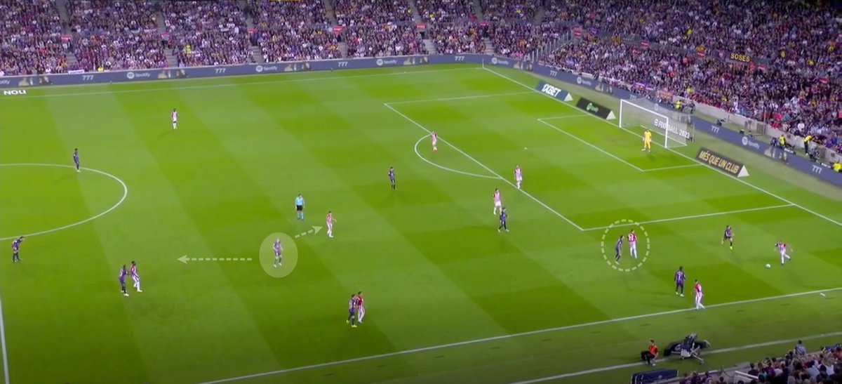 Gracias a la predisposición + sincronización + Athletic entre dos aguas, pudieron progresar. Balde estira, Pedri, dentro, dos pivotes, Lewy fijando a Yeray (DFD) para que no saltara a Pedri = ATH obligado a elegir qué tapa. El Barça jugó bien dentro para encontrar fuera.