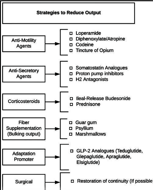 Without appropriate management, a high-output stoma can lead to dehydration, electrolyte disturbances & malnutrition. Interventions include the use of oral rehydration solutions, restriction of hypotonic fluids and dietary modifications.