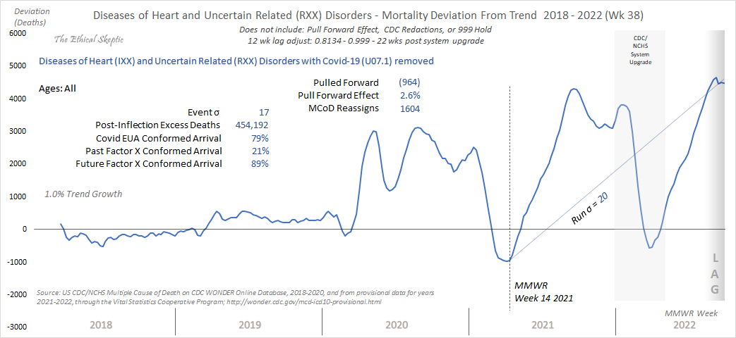 Now, let's continue with the critical flow of the model. 36,500 (R00-R99) deaths now concealed by CDC (left chart). As we confirmed yesterday - many of these are heart-related young person deaths (chart on right). Enough to conceal a 20-sigma run in cardiac-related mortality.