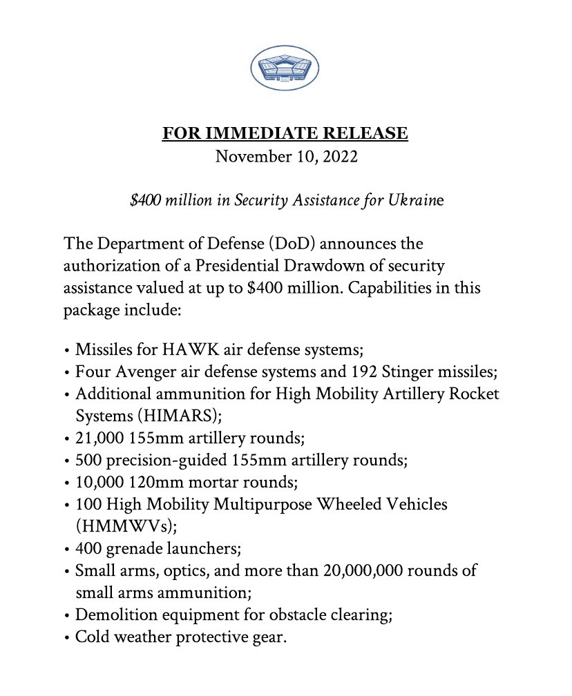 On November 4, the US DoD announced approximately $400 million in additional security assistance for Ukraine under the Ukraine Security Assistance Initiative (USAI).
