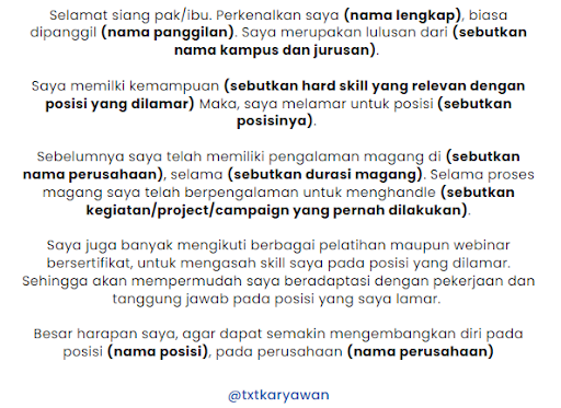 Ketika lo diminta memperkenalkan diri, sebenernya ga perlu ngasih jawaban yang panjang banget. Jawab aja secara singkat dan jelas, apa kegiatan lo sekarang, skill dan pengalaman apa yg lo punya.