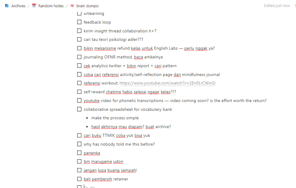p.s. jujur agak malu nunjukkin halaman brain dump di tweet pertama, soalnya isinya se-random itu :")