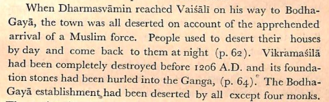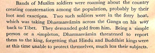 The monk she mentions was Dharmasvamin from Tibet, who came to Nalanda to study Sankrit Grammar, so that he can translate Buddhist texts into Tibetan. He recorded his journey to India & it was discovered in Lahsa much later. So does he give the islamic invaders a clean chit? No.