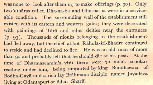 This account of Dharmasvamin also shatters the myth of Hindu - Buddhist wars. He clearly mentions a rich Brahmana disciple supporting the 90 yr old Guru Rahula & other students.