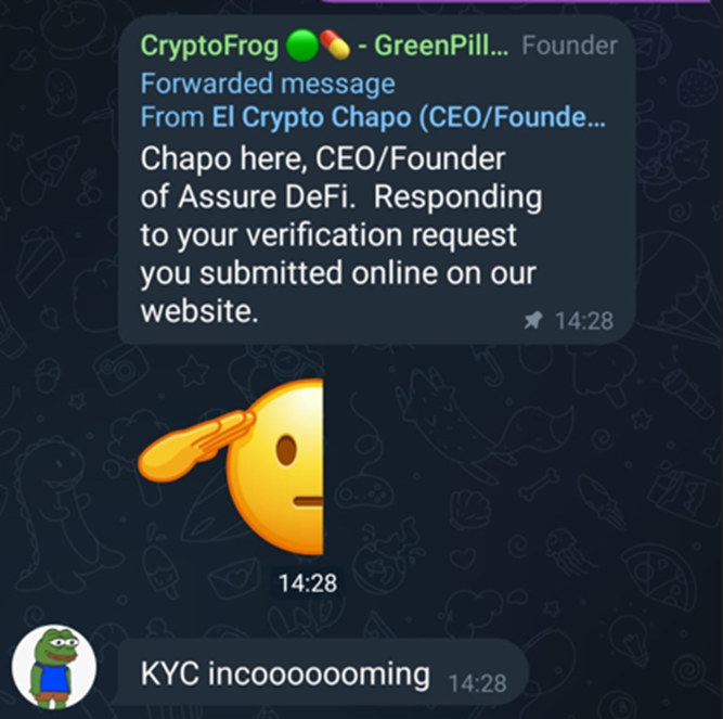 The founder of $GPILL, @GreenPillFrog, has started the third-party KYC procedure with @AssureDefi. This is the only way forward and gives me a lot of confidence in the intentions.