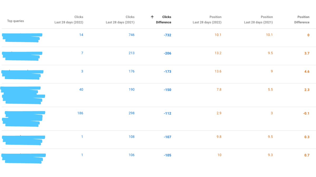 6. If you look at the top row, you can see that the clicks for that keyword have gone from 746 per month to 14 per month. Eek! 😮