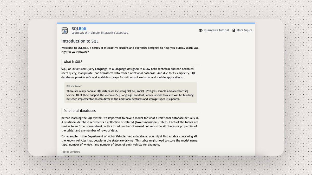A series of interactive lessons and exercises designed to help you quickly learn SQL right in your browser.