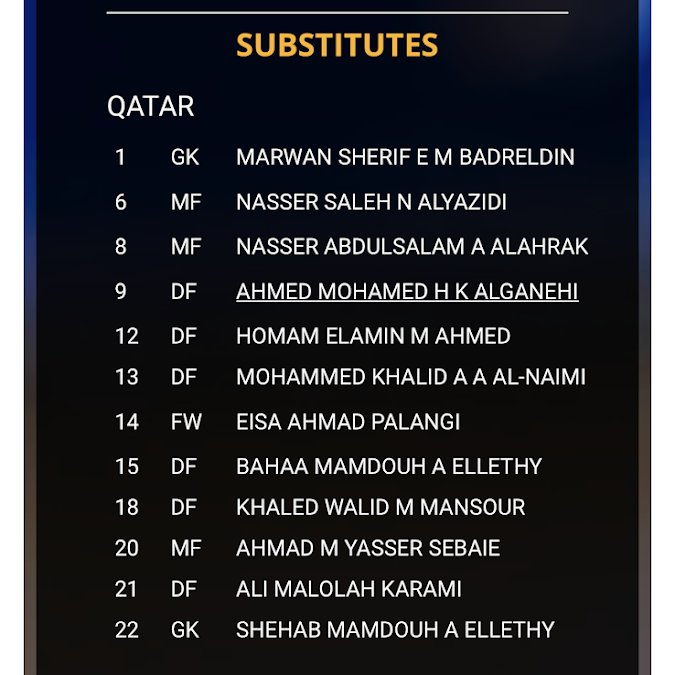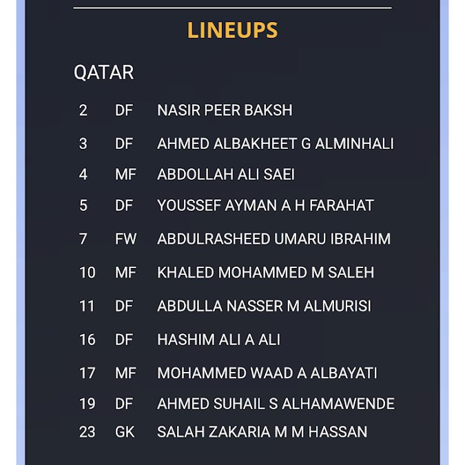 Sebelumnya, admin mau share daftar pemain Qatar waktu itu. Dari nama-nama ini, kalian inget siapa? Kalo admin inget banget pemain nomer 7 mereka waktu itu, Abdulrasheed Umaru. Doi nyetak hattrick dan ngobrak ngabrik duet Irianto-Nur Hidayat.