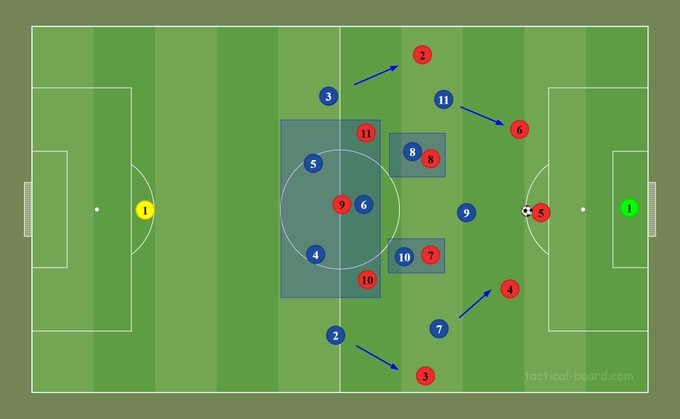 The game is essentially settled attack vs settled attack due to the aforementioned reasons. Within those attacks Denmark defend in a 5-4-1 which helps negate the quality of MbappΓ© & DembΓ©lΓ© in 1v1's. Denmark have less quality but they have numerical advantages (3v2 + 5v4). 50/50.