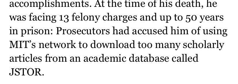I had the honour of interacting with Aaron once. It was brief exchange through messages nothing personal, but I think of him often and thankful for how he opened the internet up for me. Every time you open a free PDF online to get your next hot take itβs thanks to men like him.
