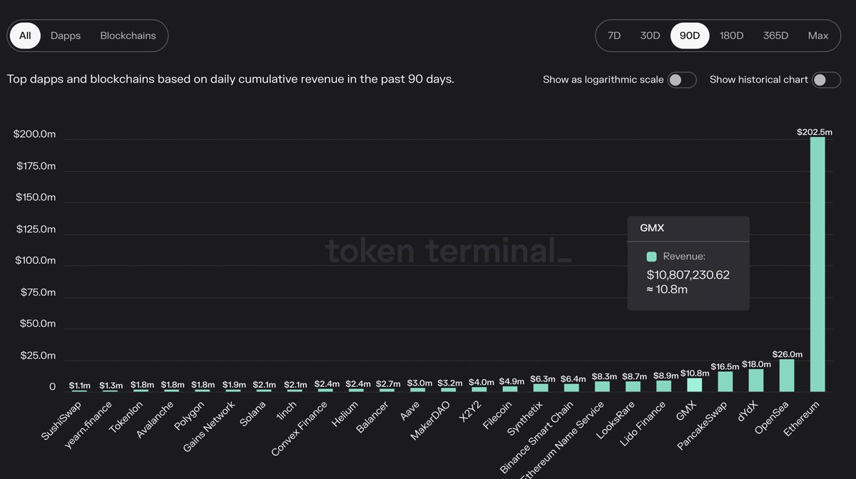A native Arbitrum dapp (GMX) is the fifth highest revenue generating protocol (last 90 days) on @tokenterminal's list of top dapps and blockchains.