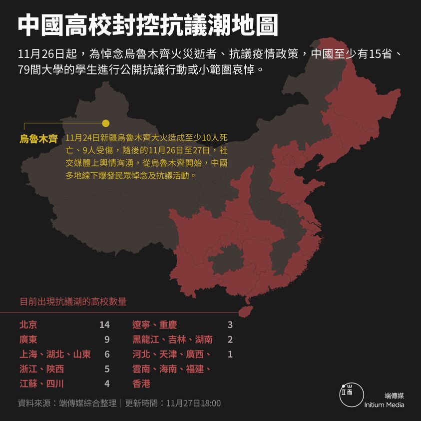 students at 79 colleges & universities in at least 15 provinces in China have held public protests or small mourning events to commemorate victims of the Urumqi fire & protest against epidemic policies. #ChinaProtests #China