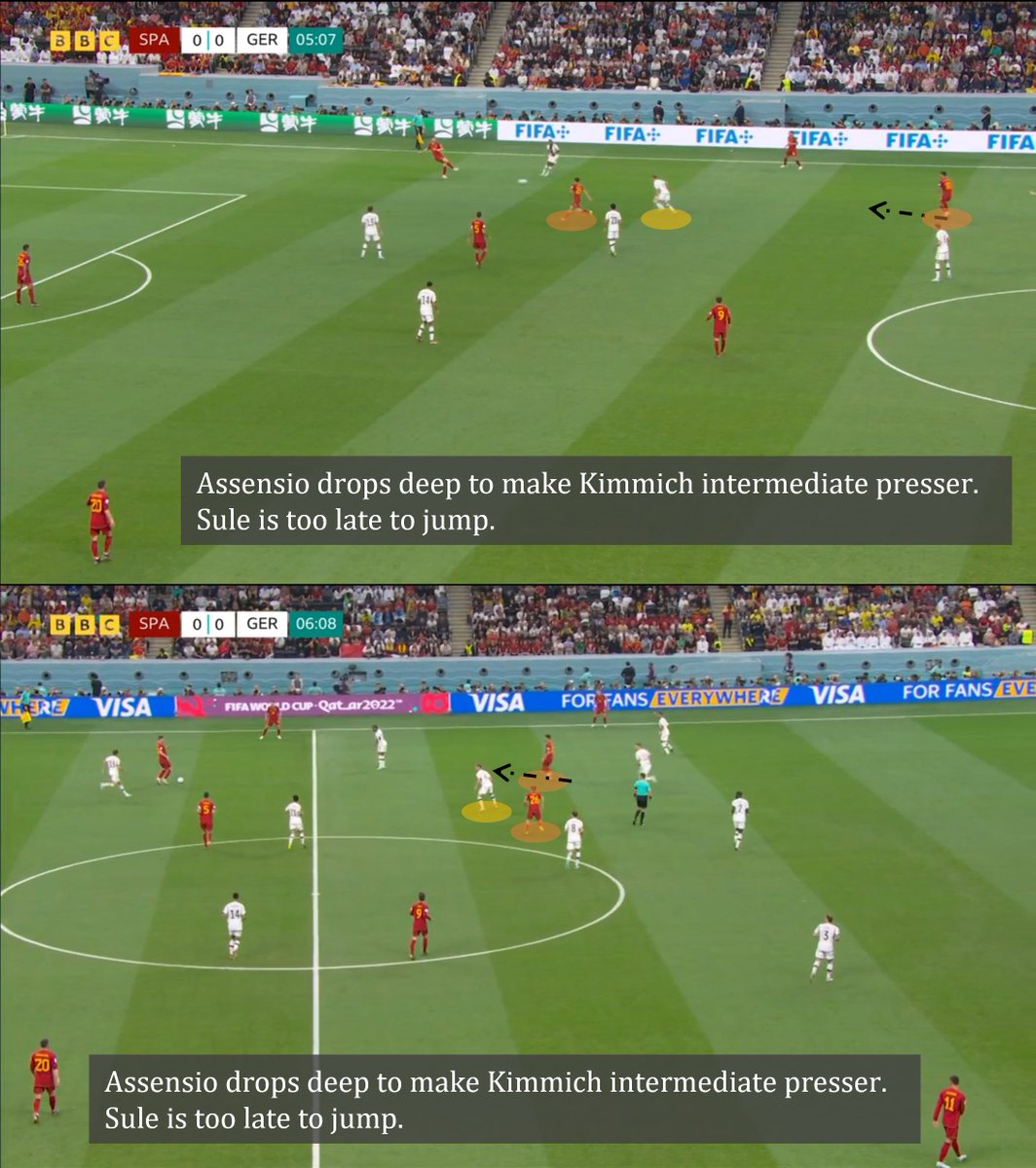This started to work immediately: Assensio receives, switches play, Morata makes runs behind Sule. It was surprising it couldn’t bring another goal for Spain.
