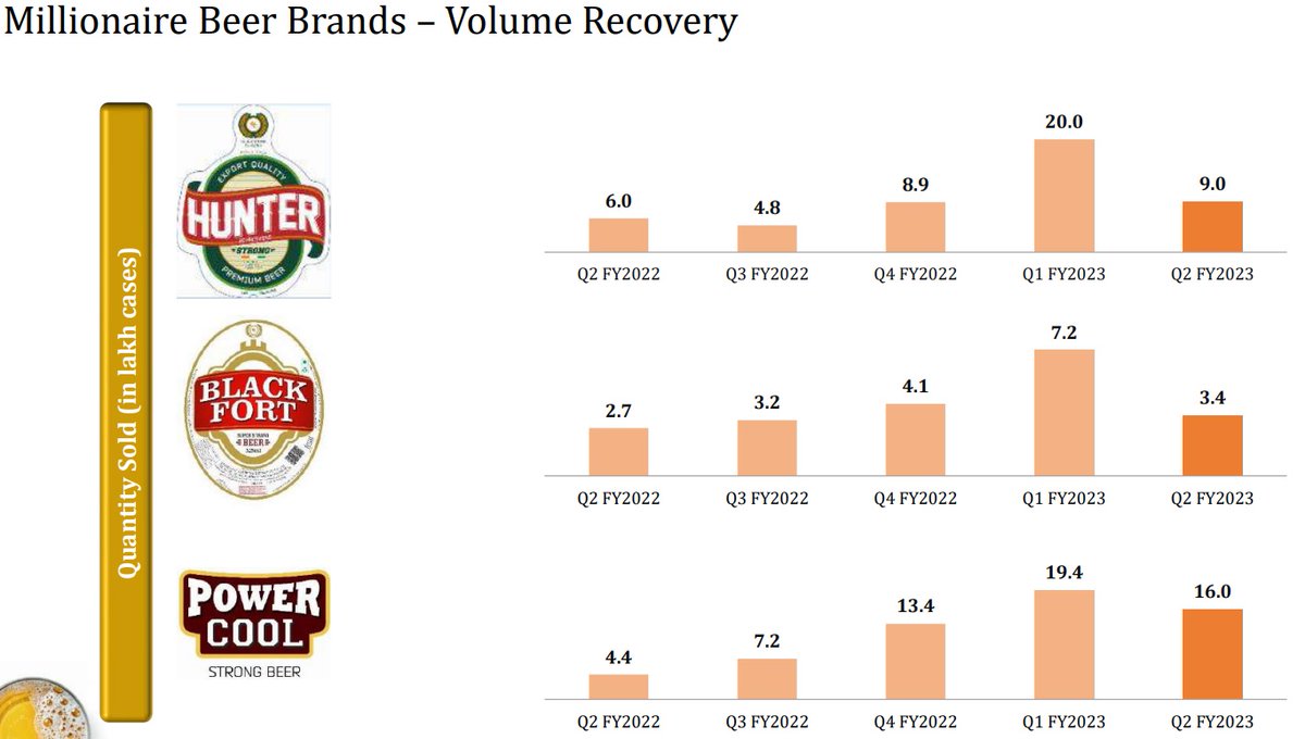 Co is also doubling its wheat beer (Woodpecker) capacity in Karnataka from 4.5mn cases to 8.5mn cases. In Orissa expansion will take capacity from 3.5lac cases/month to 8lac cases/month. The total capex stands at 150cr of which 70cr has already been expended.