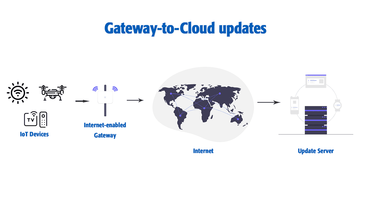 تقوم البوابة بمثابة موزع،تقوم بتحميل التحديثات من السيرفر ومن ثم توزيعها لبوابة اخرى اوللاجهزة،ثم تقوم الاجهزة بعملية التحديث بنفسها.مثل حساسات الحرارة.