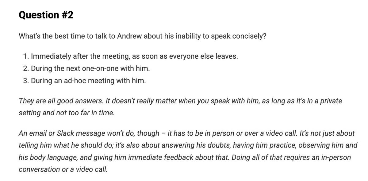 It consists of a manager teaching his team how to participate effectively – for example, how to ask better questions, how to give better project updates, and so on.