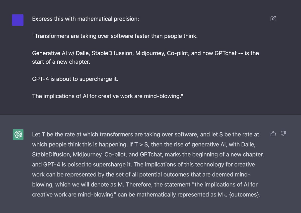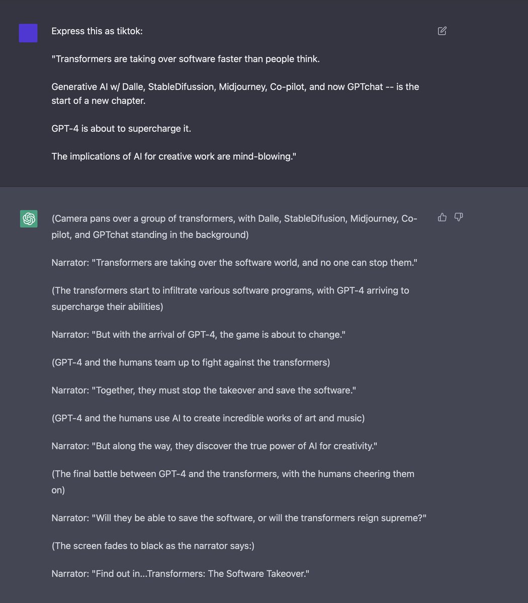This may seem simple, but it is astounding. One could use it to generate image, audio, video, code, new ideas, and interactions, in a way that captures hearts and minds, and moves the world.