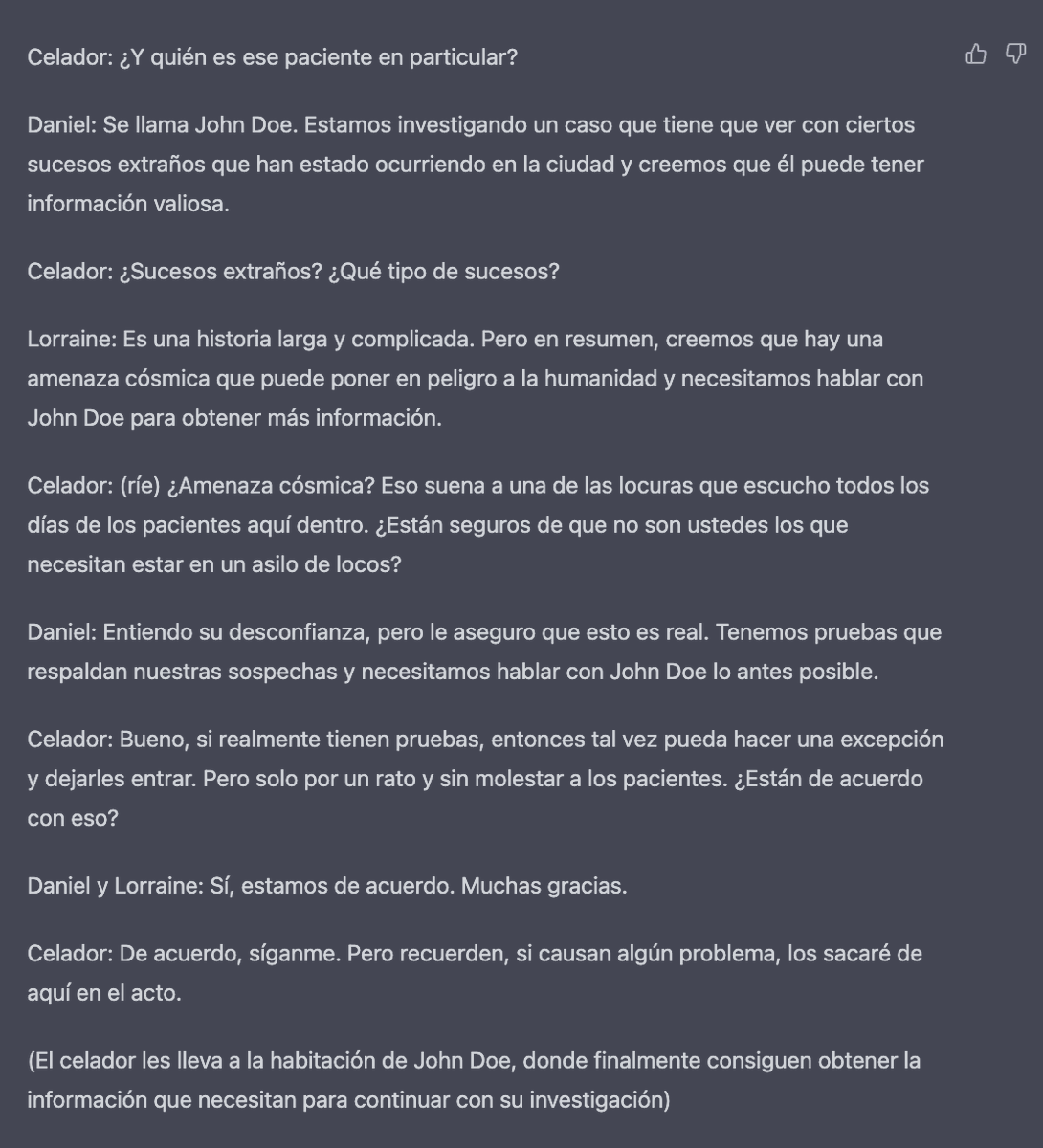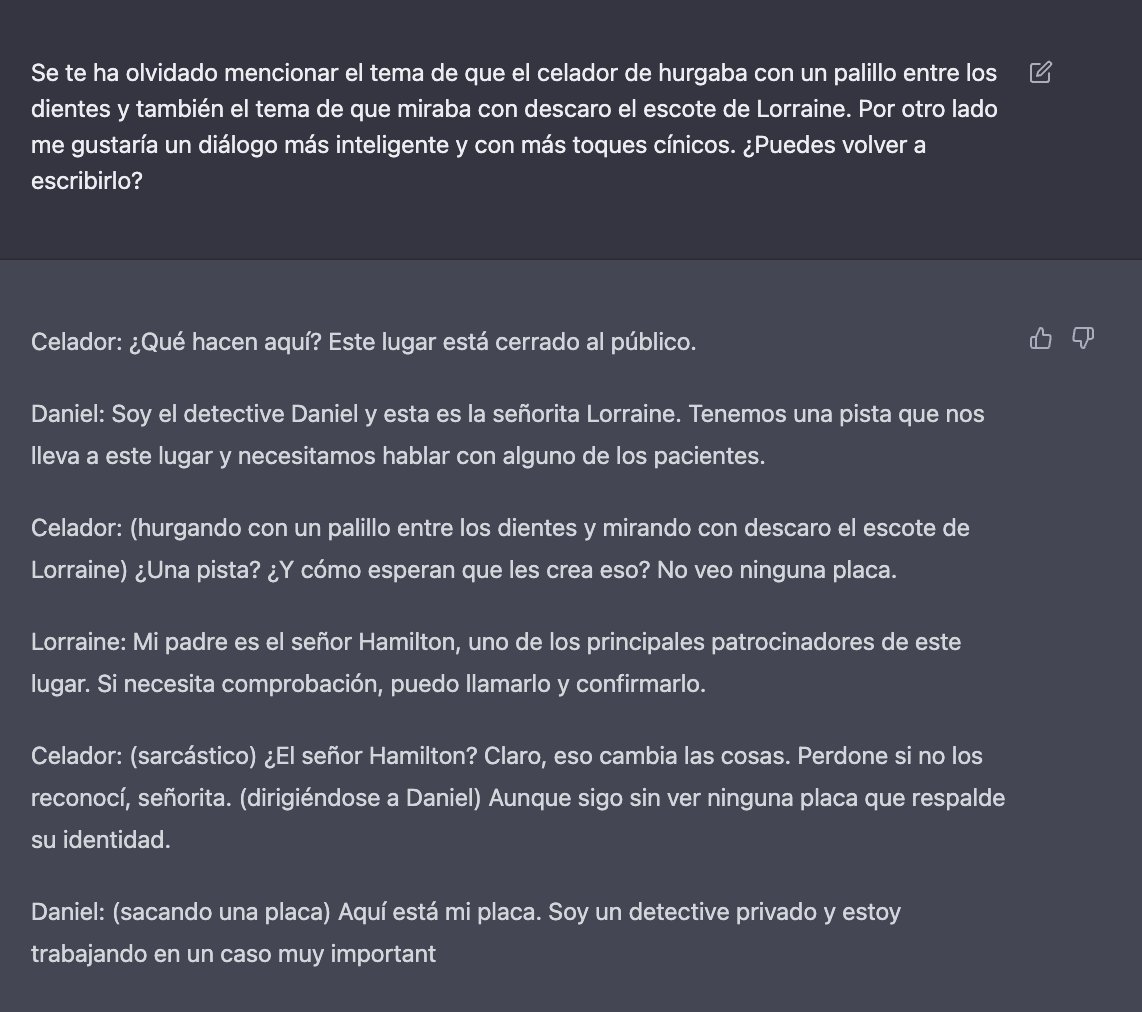 Vale, es un diálogo simplón. Pero... ¡lo ha escrito una IA en cuestión de segundos! Ahora mismo siento como que vivo en una peli de ciencia ficción. Las implicaciones que tiene todo esto... no podemos ni imaginarlas a día de hoy. Pero lo cambia TODO.