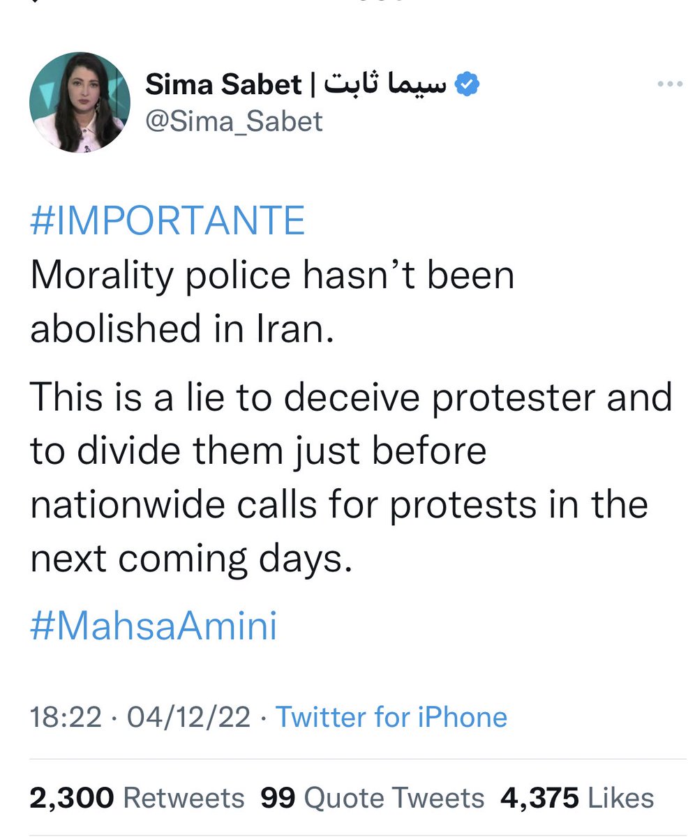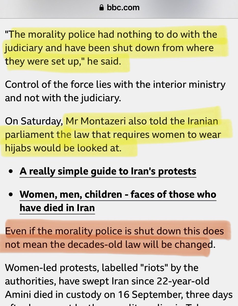 Iranian protesters are distressed by this news. Some says there is no exclusive Guard Police unit to be disbanded. Its a state run program. If you at all wants to move-on, you would uplift the hijab ban & other regressive laws, not just the monitoring.
