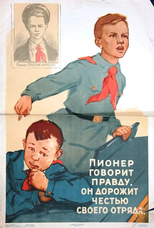 In the comic Morosov is depicted as a victim of communist brainwashing, rather than the heroic martyr figure of Soviet propaganda. Full scan here: lcamtuf.coredump.cx