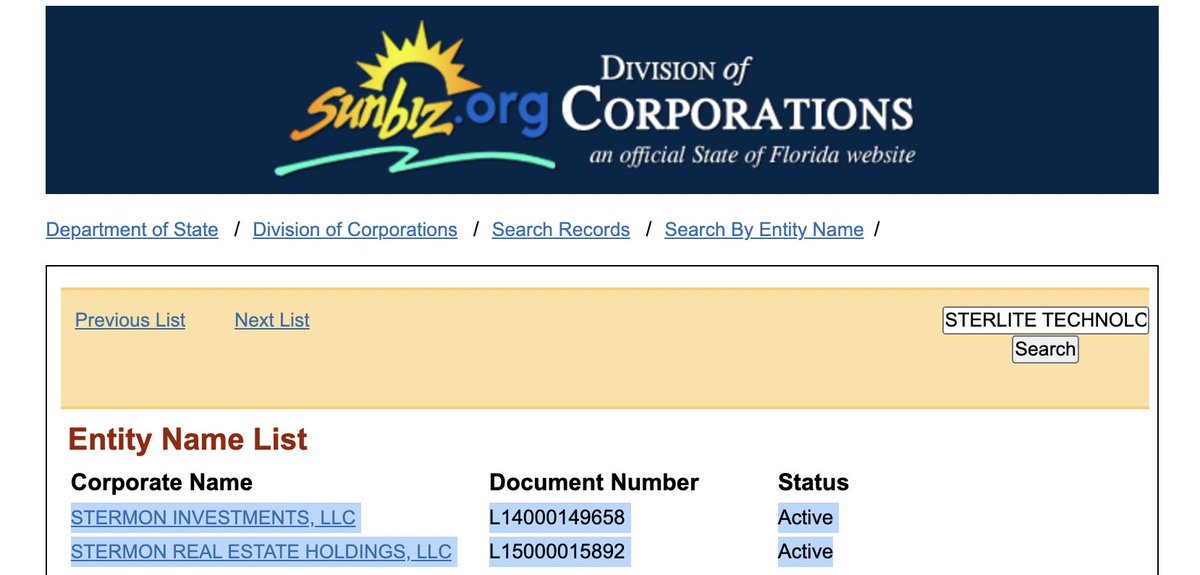 @TeresaCCarter2 @ShijeSings @amys_here Kent Stermon's wife Christie added to the number of companies in the family name, including an aviation company. Registered agent for the aviation company is Nicholas Pulignano III, an attorney whose father was a pilot. search.sunbiz.org