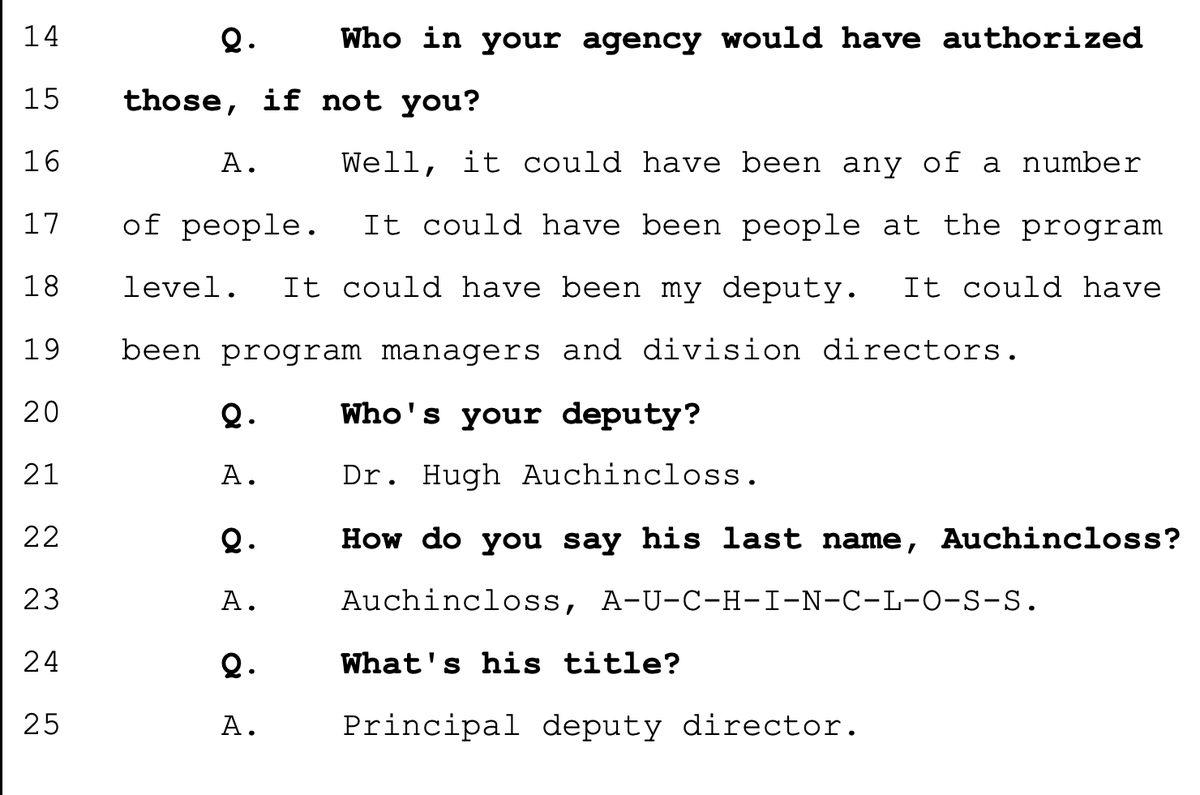 "During a recent deposition..Fauci explicitly pointed to Auchincloss as responsible for giving Baric an exemption to the agency’s ban on the deadly form of research."