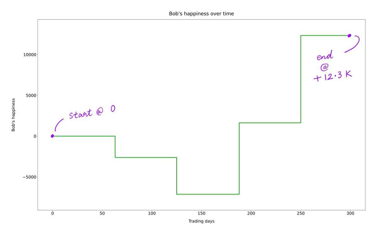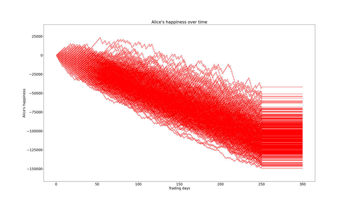 But each DOWN day *impacts* Alice's happiness severely -- thanks to loss aversion. A few more UP days aren't enough to compensate.