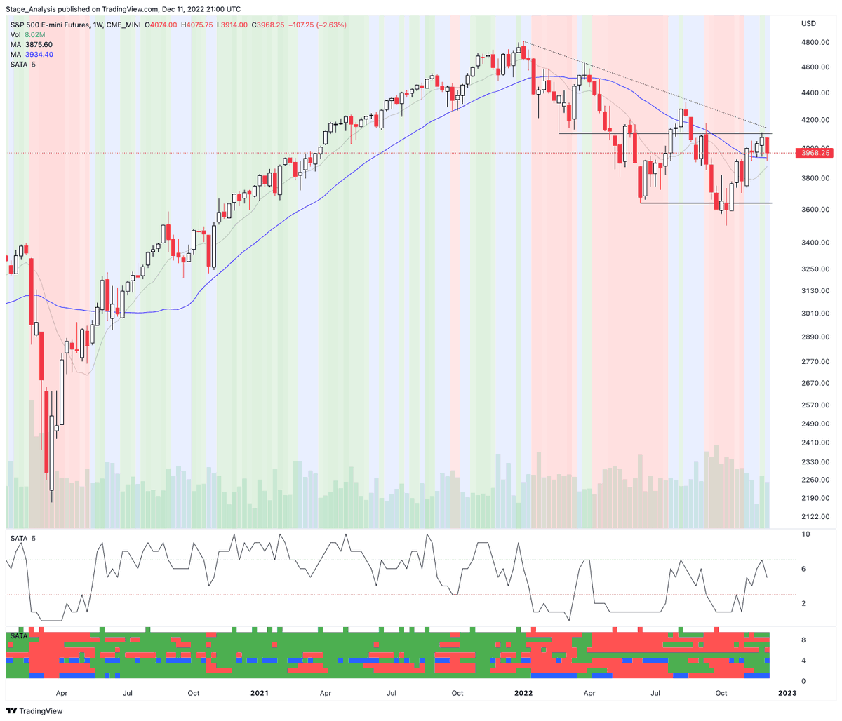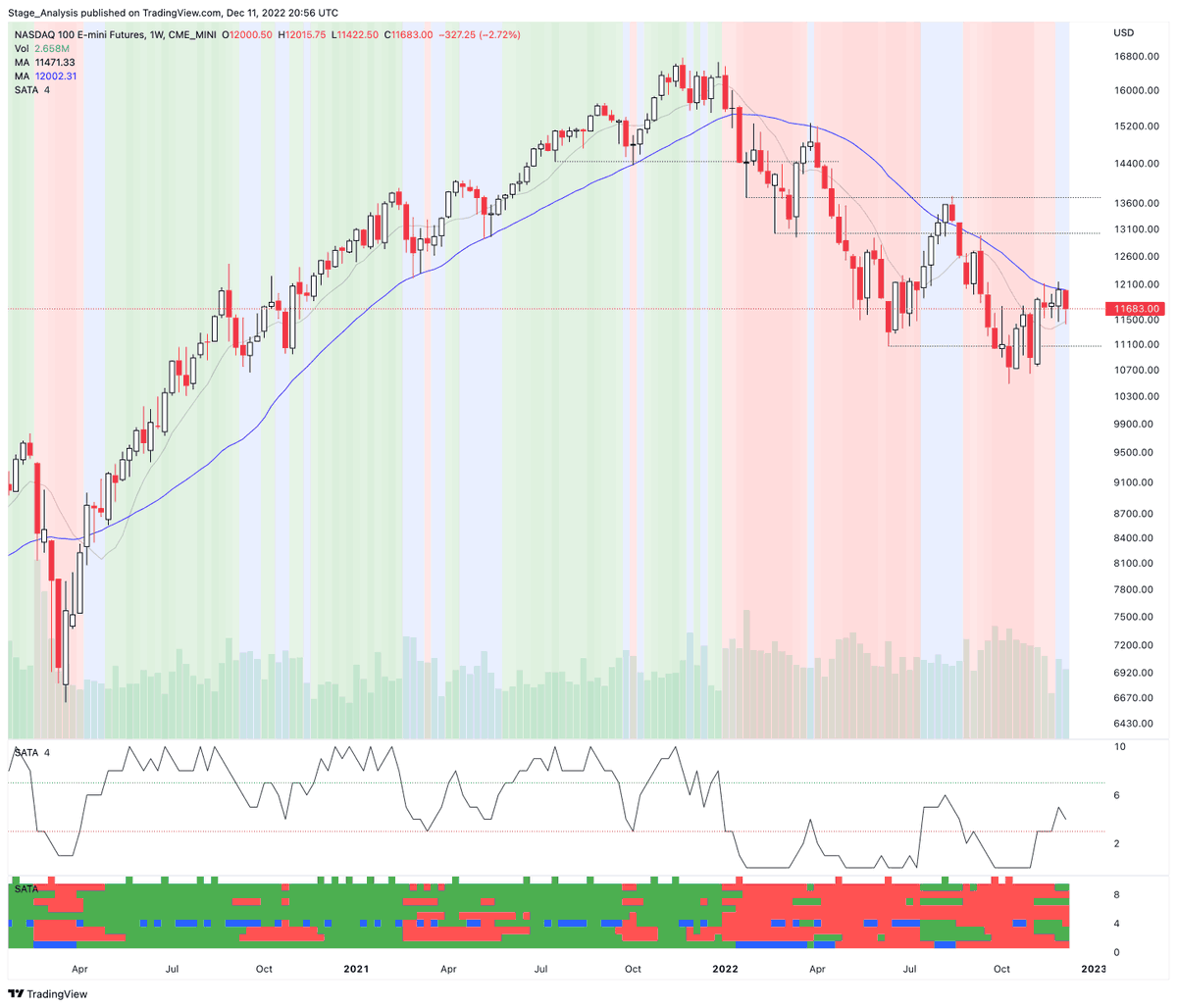Nasdaq 100 – Stage Analysis Technical Attributes (SATA) chart with multiple variations of the indicator.