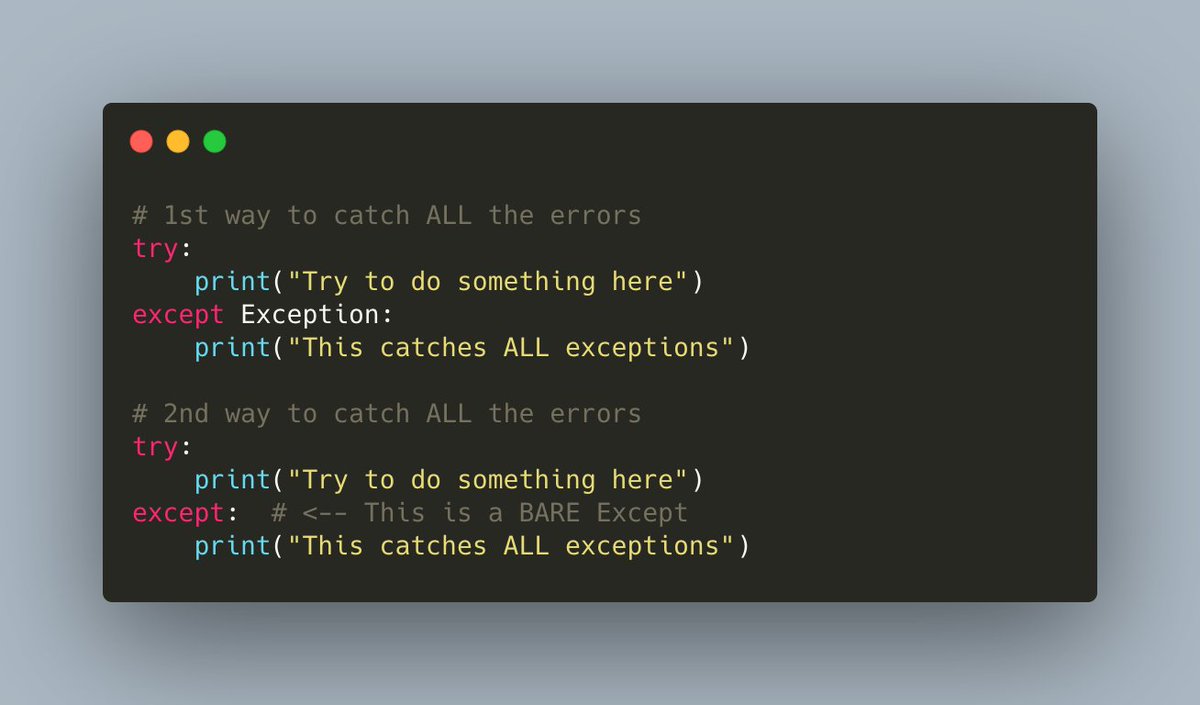#Python has the concept of the "bare except". What that means is that you catch ALL exceptions.