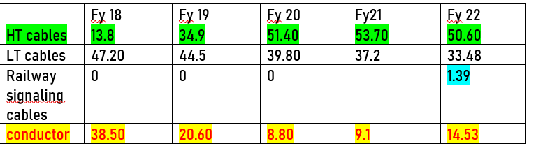 2- More focussed on high value add HT Cables , post consolidation 50%+ contribution in sales Decreasing volume of low value added conductors