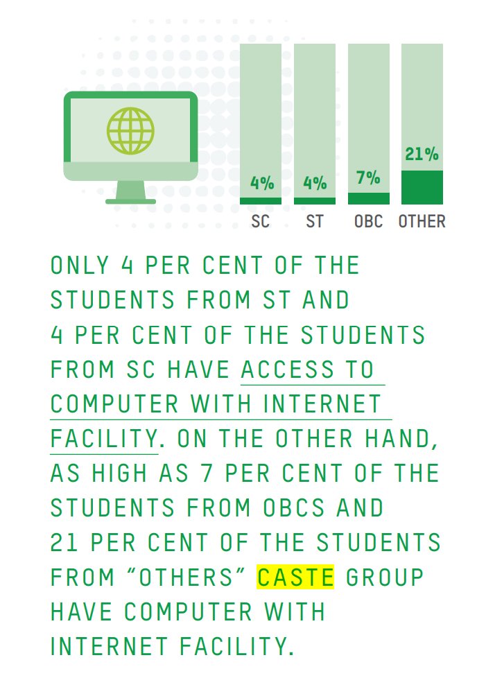 Only 4% of the students from SC and ST have access to computers with internet facilities. On the other hand, 7% of the students from OBCs and 21% from the โOthersโ caste group have computers with internet facilities. - India Inequality Report 2022: Digital Divide report