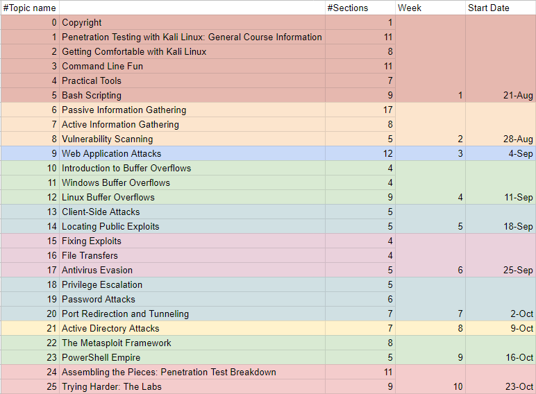 1/ قسم التأسيس ويشمل تجهيز وتثبيت وتحديثات وشرح أستخدم ال kali واعداد الخدمات كـ ssh , http ، ويوجد قسم يشرح command line بإستخدام بعض الادوات الموجوده بالنظام بشكل أفتراضي.