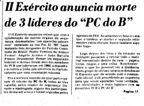 Após permitirem a saída de Telles e efetuarem algumas prisões, os agentes invadiram o imóvel e assassinaram a tiros de metralhadora os dirigentes Pedro Pomar e Ângelo Arroyo. 16/20