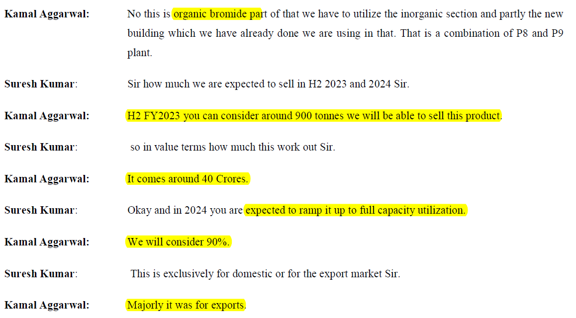 The company successfully commissioned its bromobenzene capacity of 2400 MTPA which will be made in its P9 plant. This product is a key intermediate for agrochemical industry across the globe. The company was present only in inorganic bromides like calcium bromide, zinc bromide