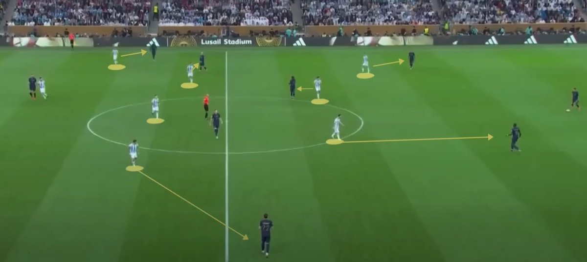 Enzo fernandez had all the space he had as French started dropping little deep, #Enzo the pivot of Argentina was able to put himself in such positions to receive the ball and distribute for flanks or via middle cutting lanes!