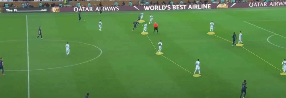 De Paul pressed Theo Hernandez and #Molina on Mbappe, #Griezmann was taken care by Mac Allister, Touchameni by Alvarez. Whenever Theo gets the ball #DePaul was on him, objecting #Mbappe and Theo combo on France's left flank.