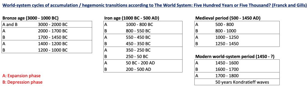 successive ~110 years cycles that occurred during the last 4 centuries, each being driven by a capitalist hegemon replacing the former one or re-succeeding itself due to both its conquests and its update of the capitalist system.