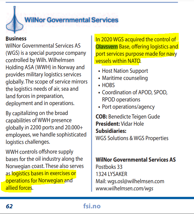 "WilNor, a subsidiary of Wilhelmsen Group, acquired 66 % of the stock in Olavsvern Group Ltd, giving it majority control of the former base, acquisition reportedly at the request of the Norwegian Defense Logistics Organization"
