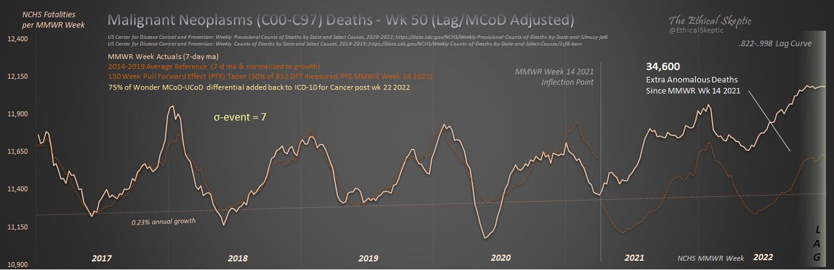MMWR Week 50 2022 Update on Pandemic Mortality Holiday week, so I used a very conservative lag adjust, as one can see with the down-hook at the very last week to the right here, for ACM. This is low. Nonetheless, like all vaxxed nations, US is high in E-NCNC Mortality at 15.4%.
