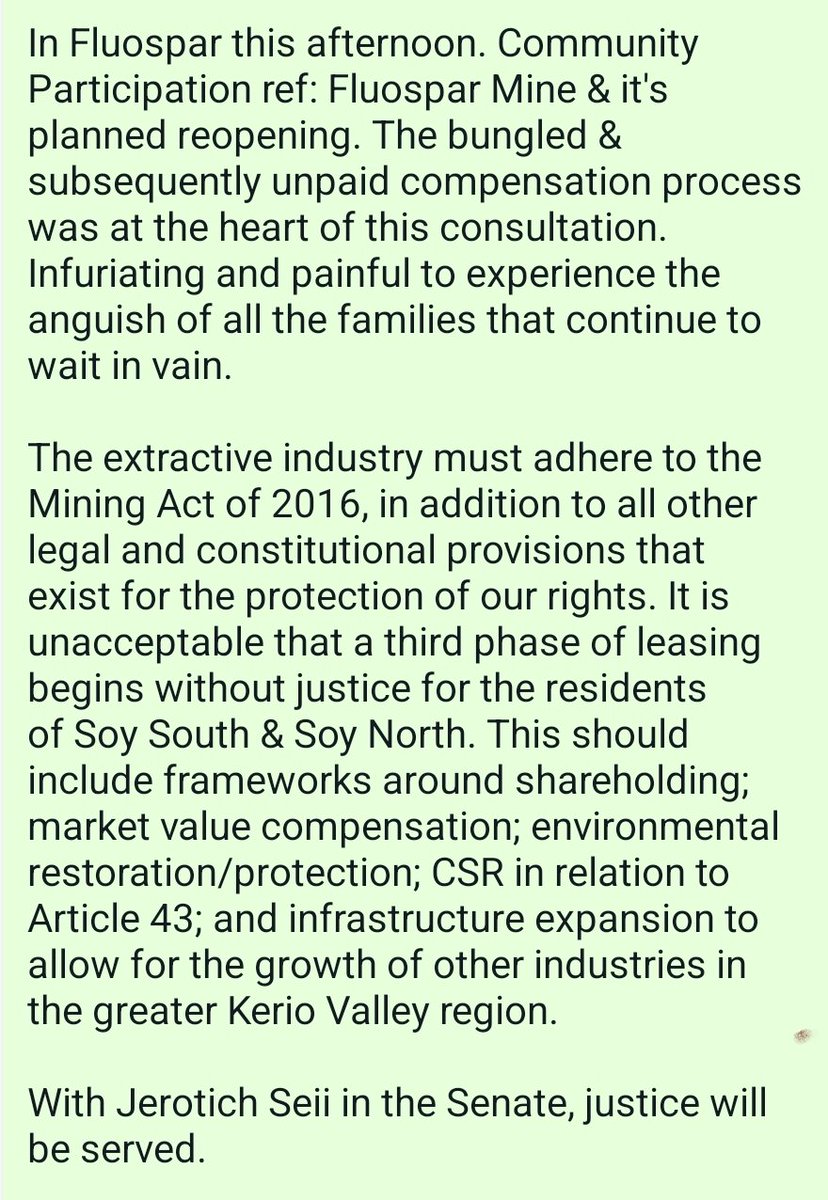 4. Fluorspar, Soy South Ward - Keiyo South: public participation for the planned reopening of the mine. Infuriating & painful to listen to families that have waited in vain for justice. The extractive industry must adhere to the Mining Act of 2016.