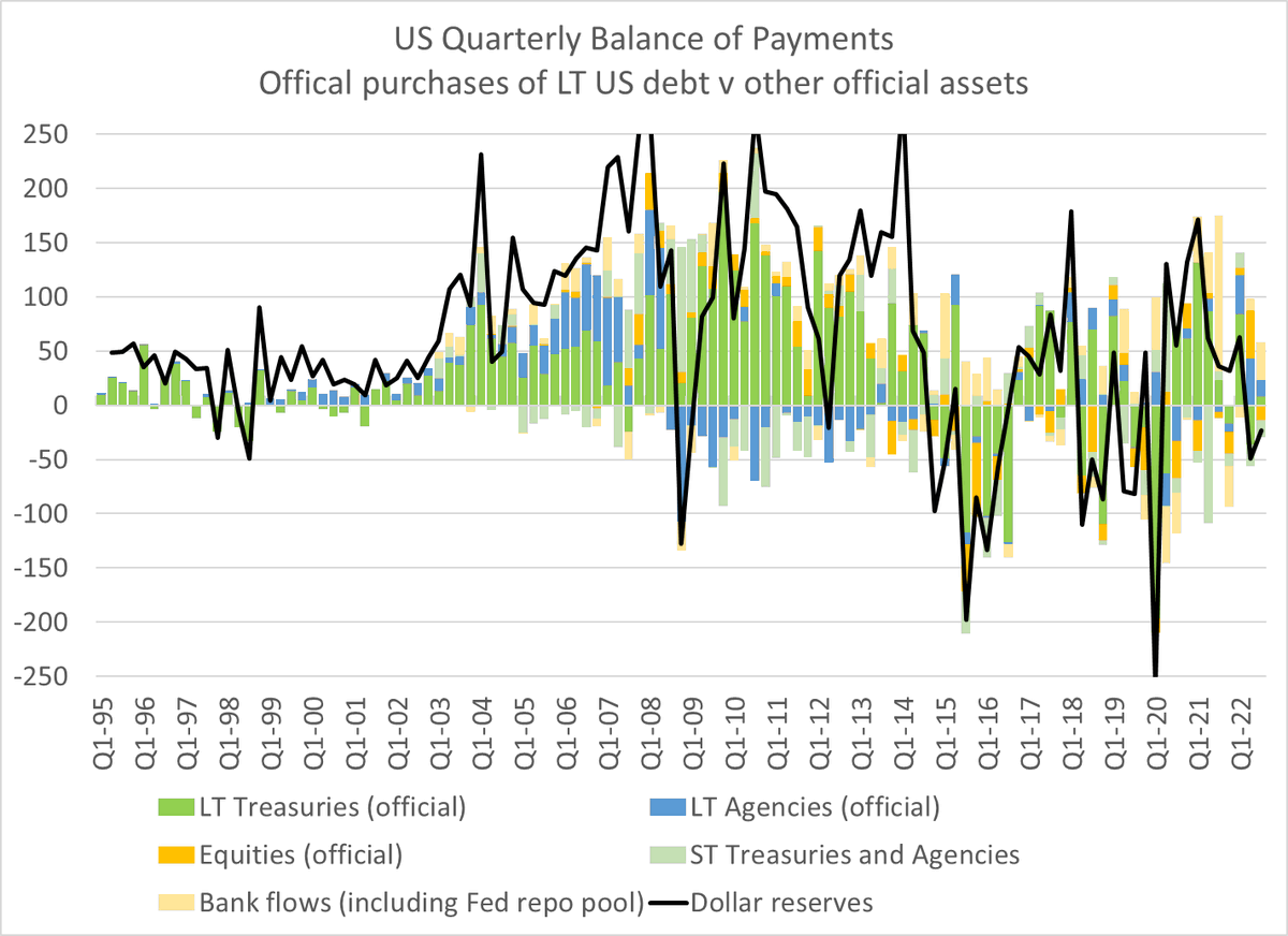 @RashadA334 and the dollar reserve stock numbers are from the imf's COFER data set, so compiled from the reporting of the reserves of its members (independent of the US custodial data underlying both the US bop and flow of funds)