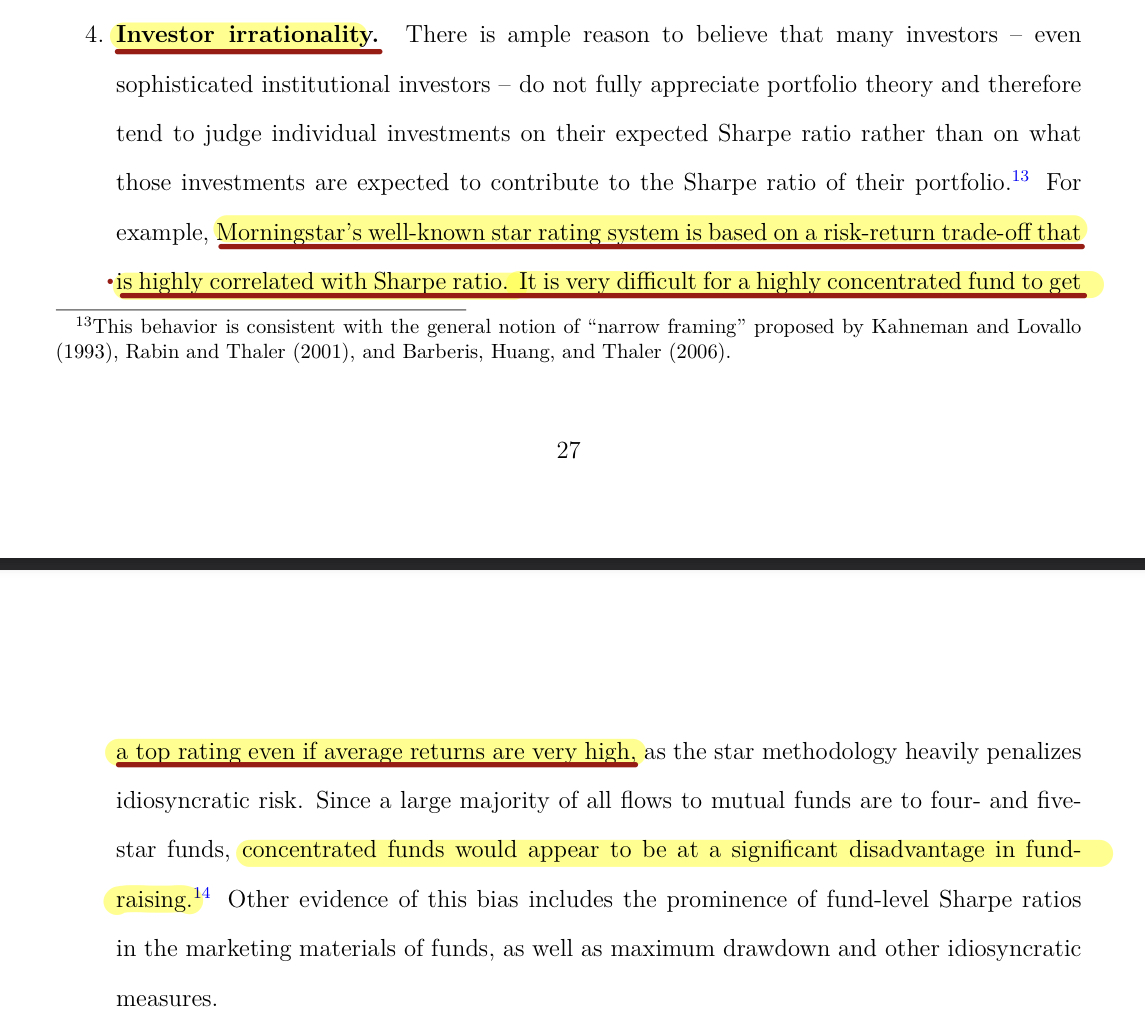 1/ Interesting paper by Harvard and IESE Business School that shows that fund managers have the ability to outperform with their best ideas but fall prey of "diworsification"